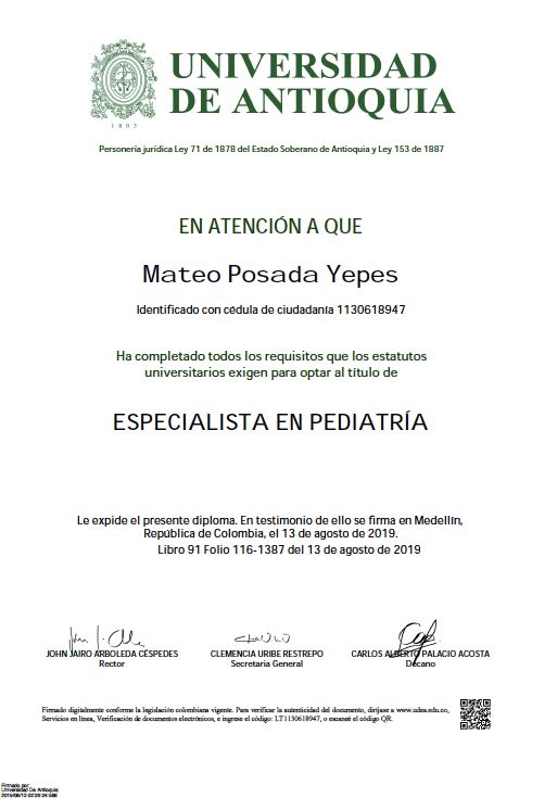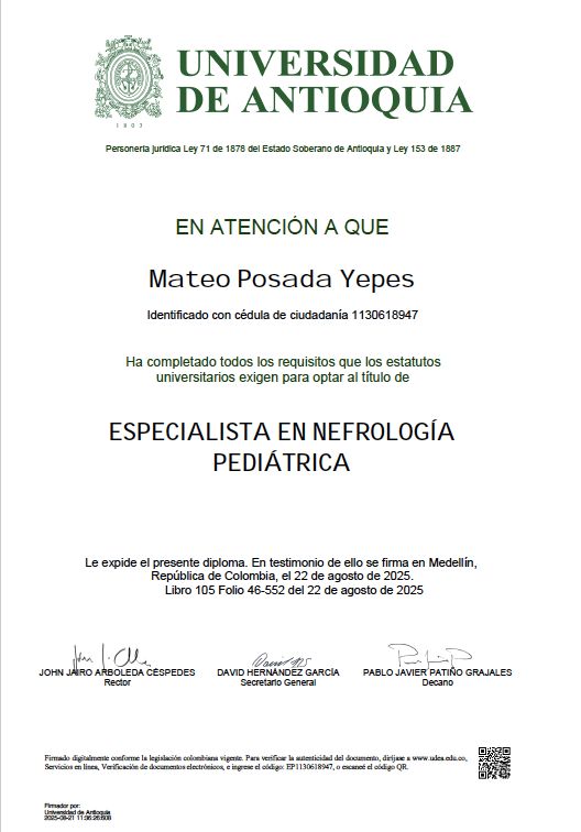 Soy el Dr. Mateo Posada, pediatra y nefrólogo pediatra formado en la Universidad de Antioquia. Brindo atención especializada a niños y adolescentes con enfermedades renales, tanto en consulta presencial en Medellín como de forma virtual. Ofrezco una atención profesional, cálida y humana, con comunicación clara y orientación personalizada para cada familia. Atención disponible en español e inglés.